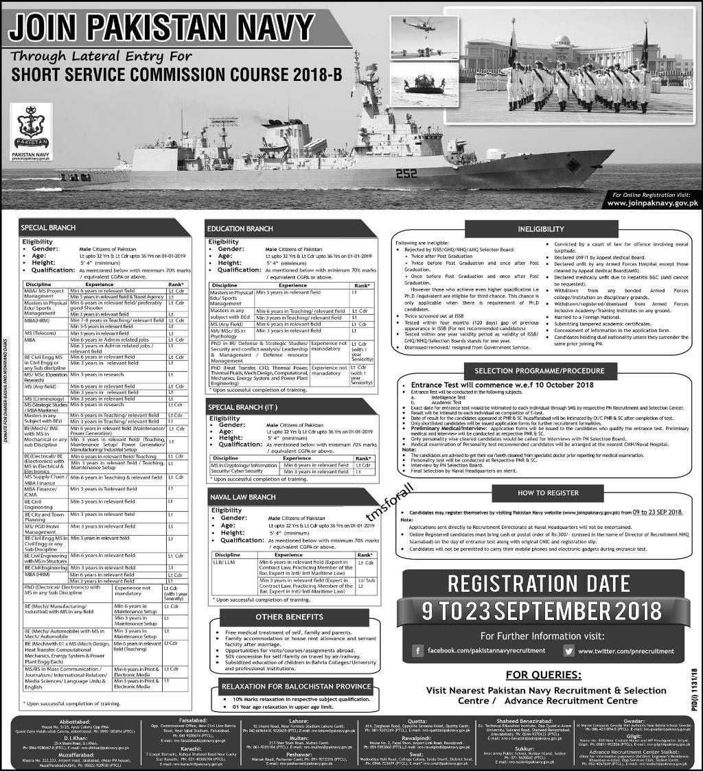 Join Pakistan Navy Through Lateral Entry Short Service Commission Course 2018-B Last Date For Online Registration:23 Sep