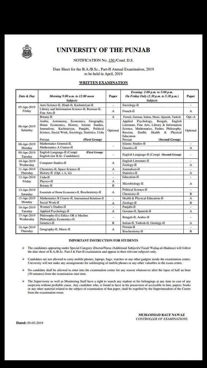 Punjab University has issued BA/BSc Part l-ll And Composite annual exam 2019 date sheet. The Exam will begin from 5th April.pic.twitter.com/ixSd1SVSV2