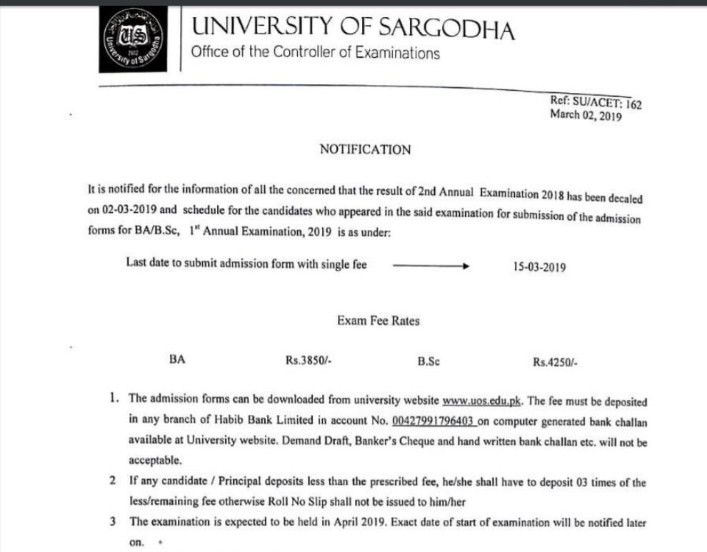 #UOS Adm Schedule: BA / BSc 1st Annual 2019(4 Students who failed in 2nd Annual Exam,2018)And Now Want To Appear In 1st Annual Exams 2019 Last Date:15 March pic.twitter.com/Ud0p7qcJuf